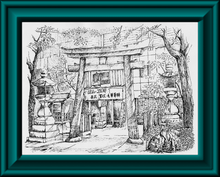 商店街の中の神社、大阪ではよくある風景です。鳥居の向こうに見える古めかしいはんこ屋さんがなんとも風情です。